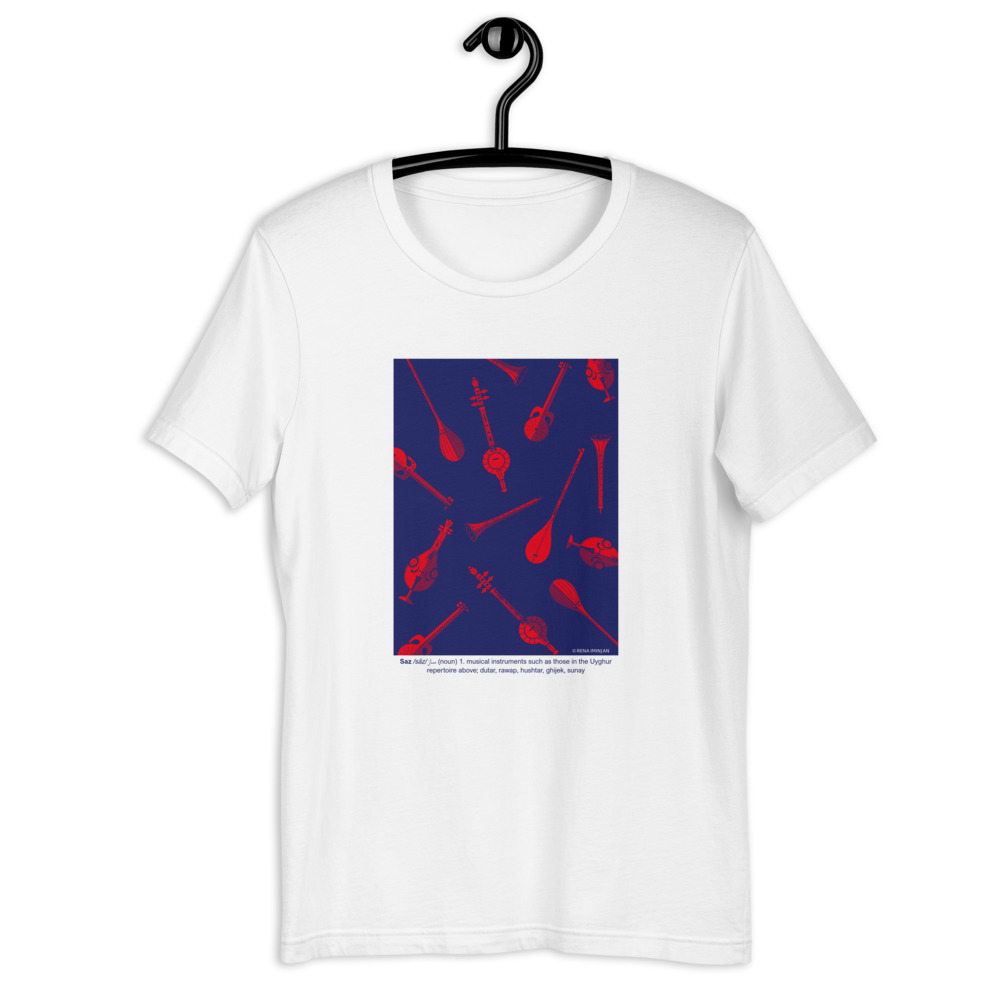 An elegant design by Rena Iminjan showcasing Uyghur musical instruments and evoking a love for culture