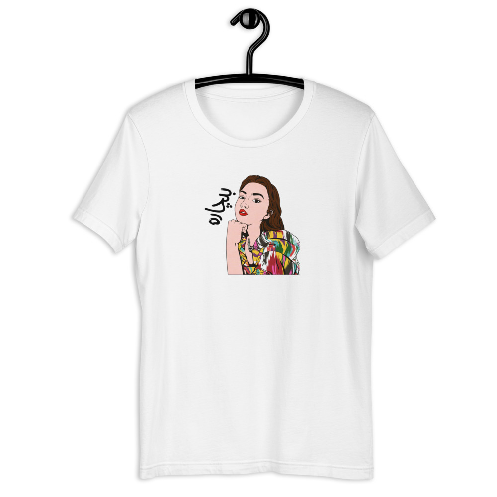 A vintage-comic inspired Uyghur girl in etles, looking at the world and thinking ah... bichare (بىچارە)