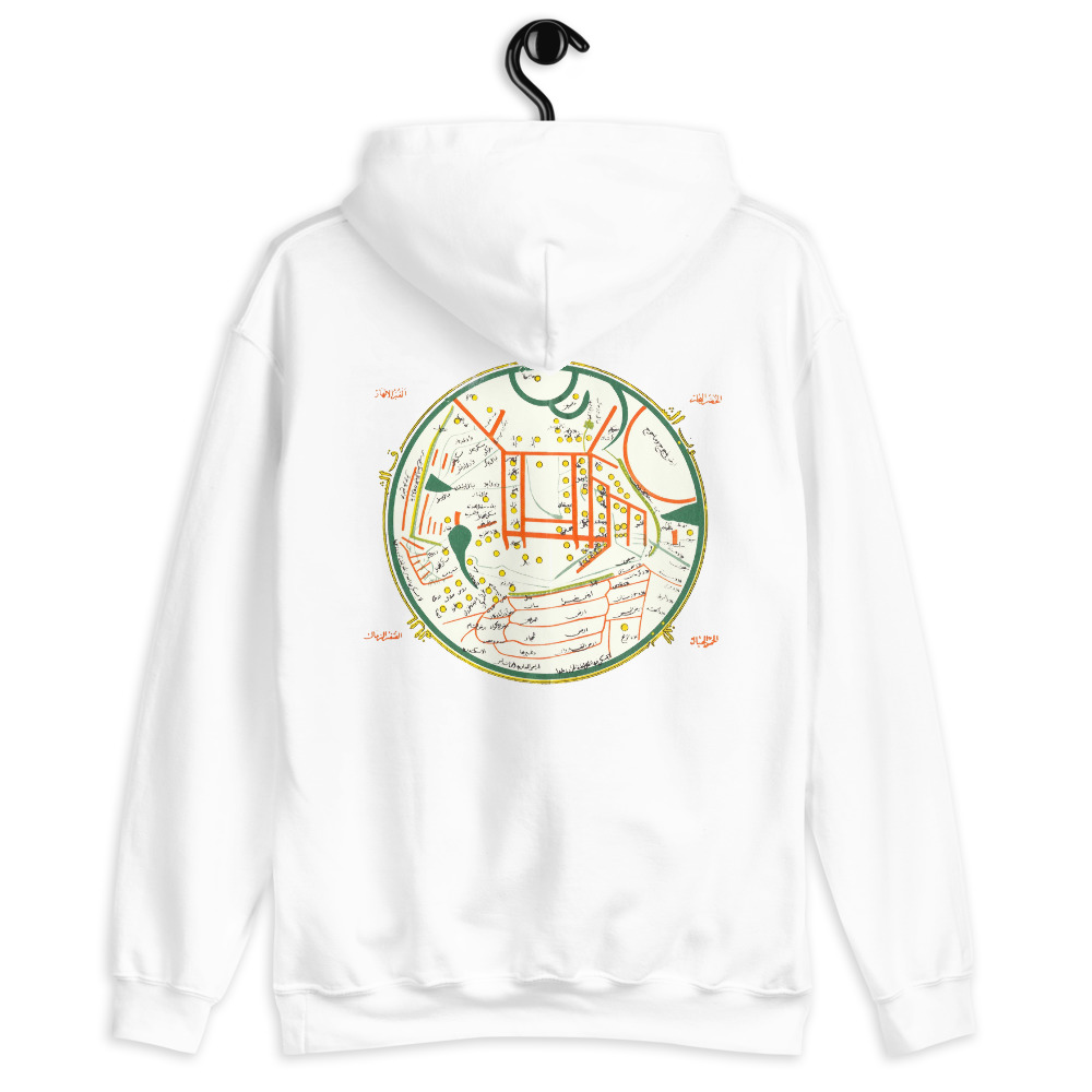 The design on the back of this hoodie depicts the map from Mahmud Kashgari's Dīwān Lughāt al-Turk. Read the link below for a fascinating description of the map and its significance!