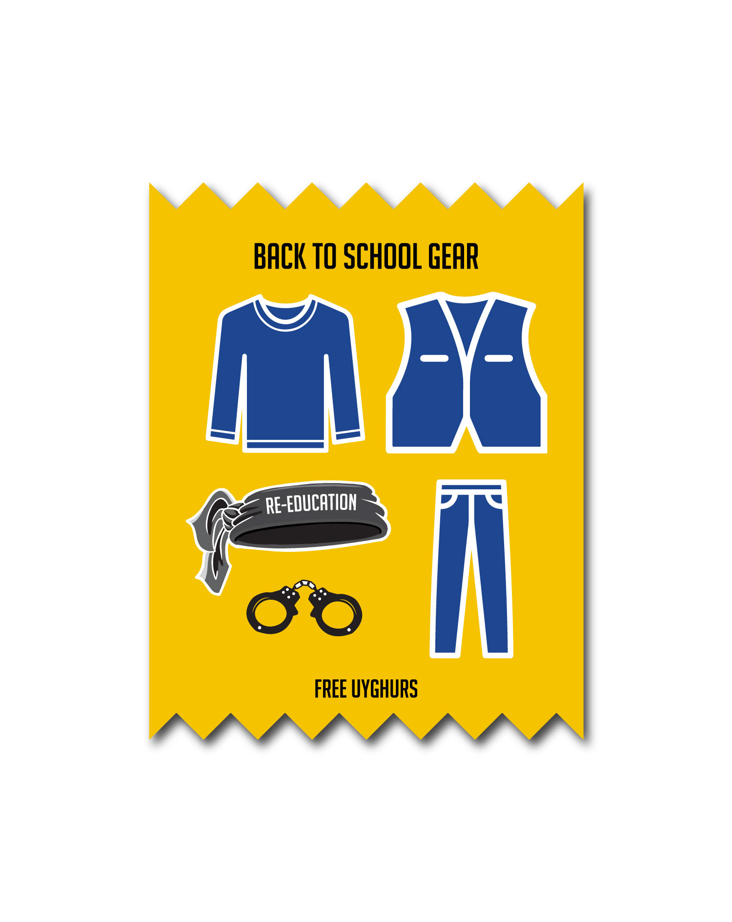 "Back to School - Free Uyghurs" sticker illustrating the "re-education" ootd: prison uniforms, blindfolds, and handcuffs. This is a play on the Chinese government's insistence that the concentration camps are "vocational schools" despite the mounting evidence describing something much more sinister.